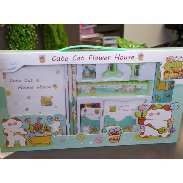 طقم قرطاسية مستطيل اخضر(قطة) 8/5-CUTE CAT